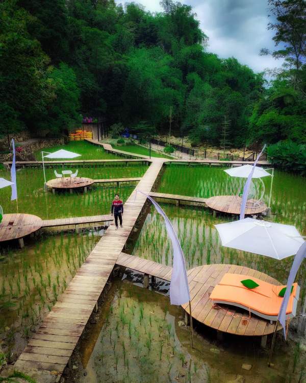 area ini sangat instagramable karena letaknya berada di tengah sawah dan dibuat pergrup ala-ala penginapan resort di tengah pantai. untuk menghubungkan tiap grup dibuat jalan setapak yang terbuat dari bahan kayu.