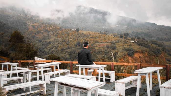 spotnya sendiri bertema alam yang menawarkan suasana perbukitan dan di bagian bawah terdapat tempat duduk berwarna putih berjejer rapi yang siap kamu datangi.