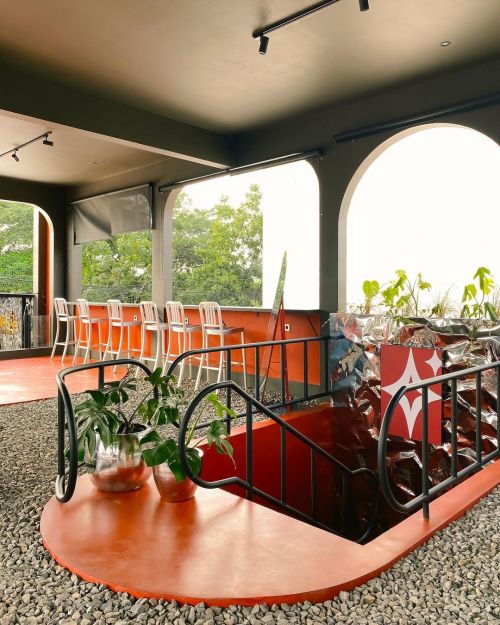 yang dilengkapi dengan area indoor dan outdoor luas dengan perpaduan warna hitam dan terakota.